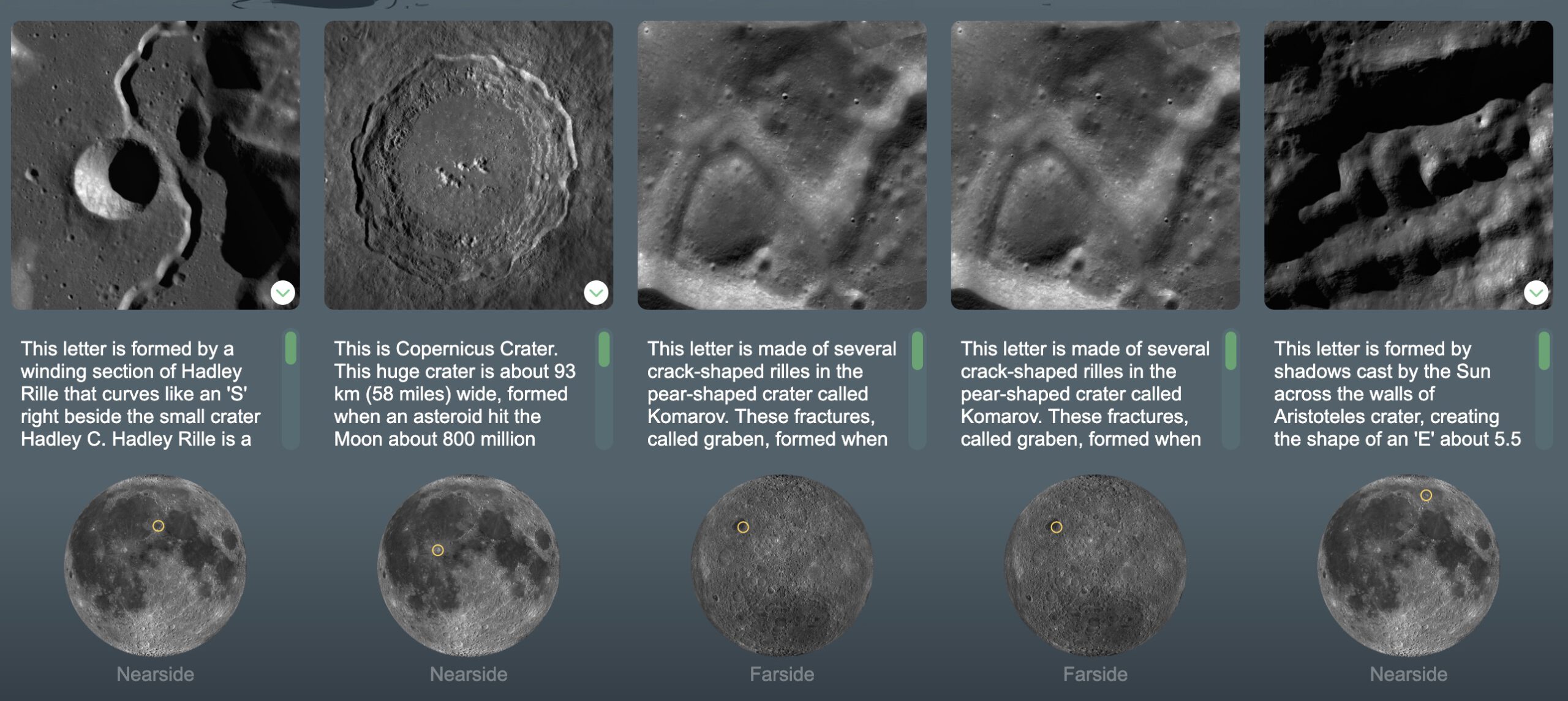 David Charney hat mit „Alphabet Moon“ eine Website erstellt, auf der man jedes beliebige Wort eingeben können, das dann anhand einer Reihe von Fotos von Mondmerkmalen in der Form des jeweiligen Buchstabens darstellt. Außerdem werden die Details hinter jedem Mondmerkmal erläutert und der Standort dargestellt. Leider läuft die Seite aktuell nicht sonderlich stabil, so dass ich diverse Male aktualisieren musste.