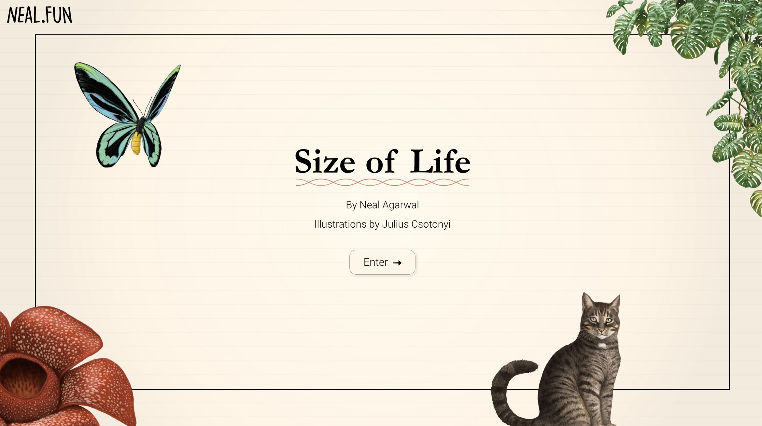 Zum Inhalt springen -->Größenvergleich von allem, was mit dem Leben zu tun hat. Sehr hübsch illustriert von Julius Csotonyi. Da geht er dahin, der Tag.