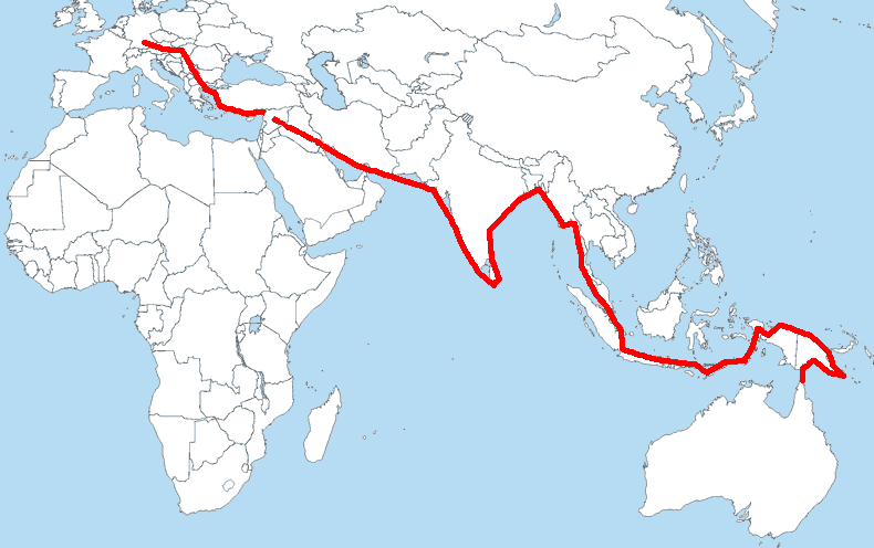 Nach Ankunft in der Ägäis fuhr er an der anatolischen Küste entlang bis nach Syrien, transportierte sein Faltboot auf dem Landweg nach Maskanah am Euphrat und setzte seine Fahrt von dort durch den Persischen Golf und entlang der Küsten von Indien, Malaya, Java und Bali nach Australien fort. Seine Anlandung fand am Strand der Insel Saibai statt, die sich in der Torres-Straße etwa 100 Kilometer nördlich der Thursday Island befindet. Beide Territorien gehören geografisch zur nördlichsten Gemeinde Australiens, Torres Shire. Er erreichte Thursday Island im September 1939. Kurz zuvor war, ohne dass Speck schon davon erfahren hatte, der Zweite Weltkrieg ausgebrochen. Daher wurde er unmittelbar nach seiner Ankunft verhaftet und als feindlicher Ausländer bis 1945 in Tatura, Victoria, interniert.