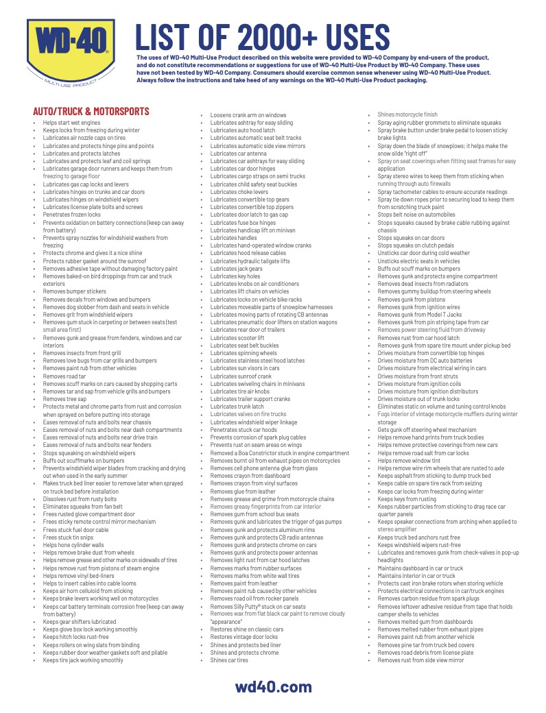 Zum Inhalt springen -->Milde interessant: über 2000 vom Hersteller offiziell gelistete Anwendungsmöglichkeiten für das Allheilmittel WD-40 auf einem 13-seitigen PDF.